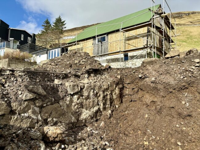 Grundin hjá kongaliga einahandlinum í Vestmanna er komin undan aftur. Hon hevur annars verið undir mold í fleiri áratíggju. Vestmanna kommuna er farin undir at grava bakkan burtur niðan fyri faktorhúsið og pakkhúsið á Fitjum. Har, sum grasbakkin er í dag, stóð kongaligi einahandilin, og gamlar myndir vísa slætta vakra hellu, laðaðan garð fram við…