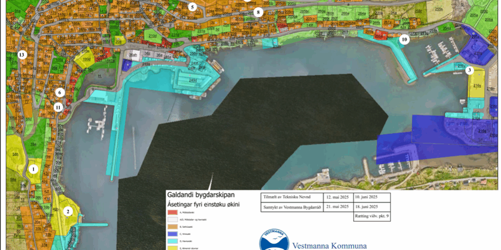 Við heimild í løgtingslóg nr. 13 frá 21. mai 1954, seinast broytt við løgtingslóg nr. 19 frá 18. mars 2013, um býarskipanir og byggisamtyktir verður við hesum boðað frá, at Vestmanna Bygdarráð á fundum 21. mai og 18. juni 2025 hevur samtykt broytingar í byggisamtyktini og bygdarskipanini fyri Vestmanna kommunu.