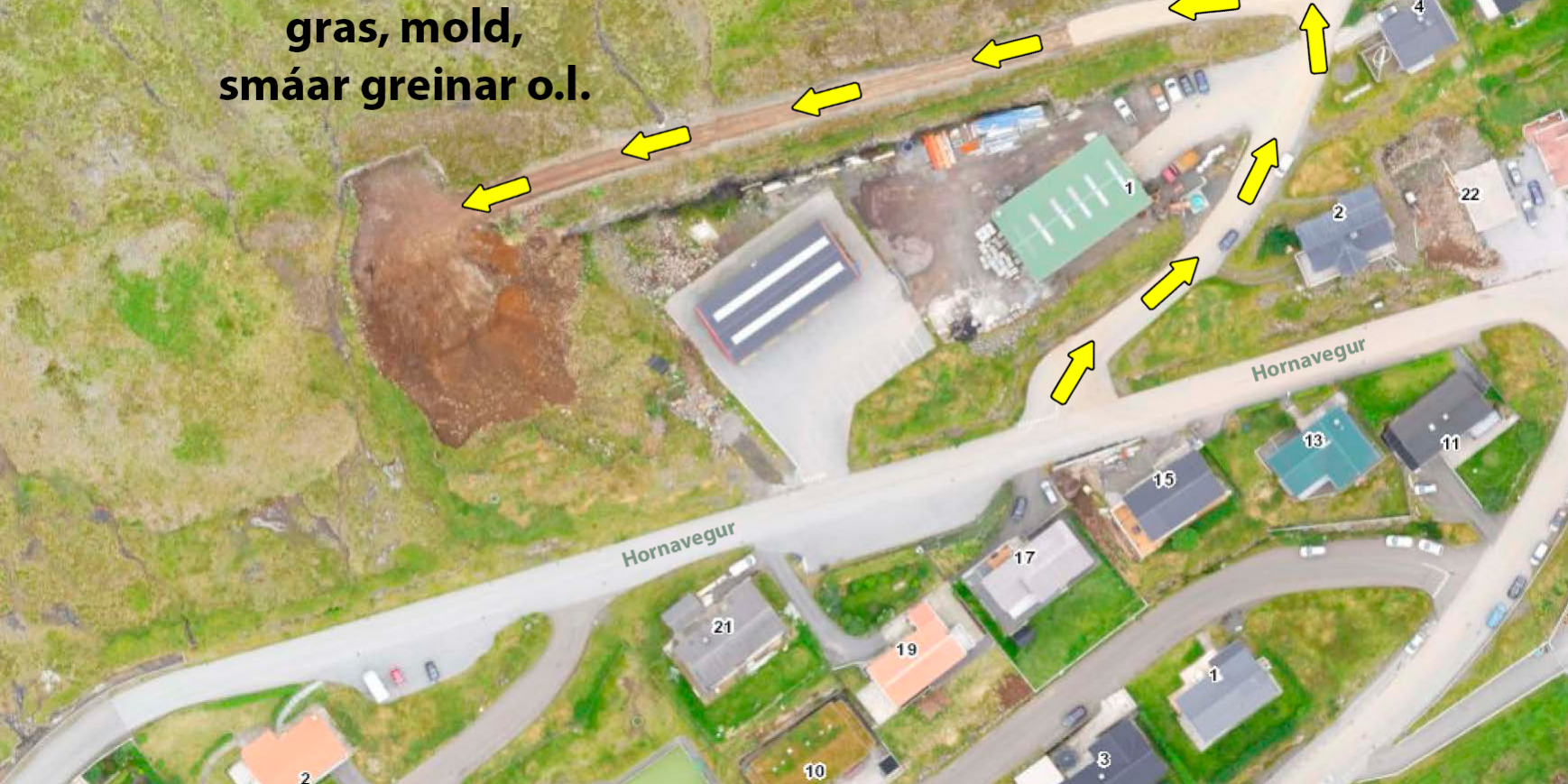 Gras og urtagarðsleivdir skulu koyrast í moldgoymsluna oman fyri kommunuhøllina, sí mynd omanfyri.