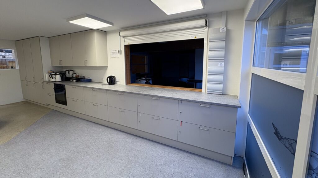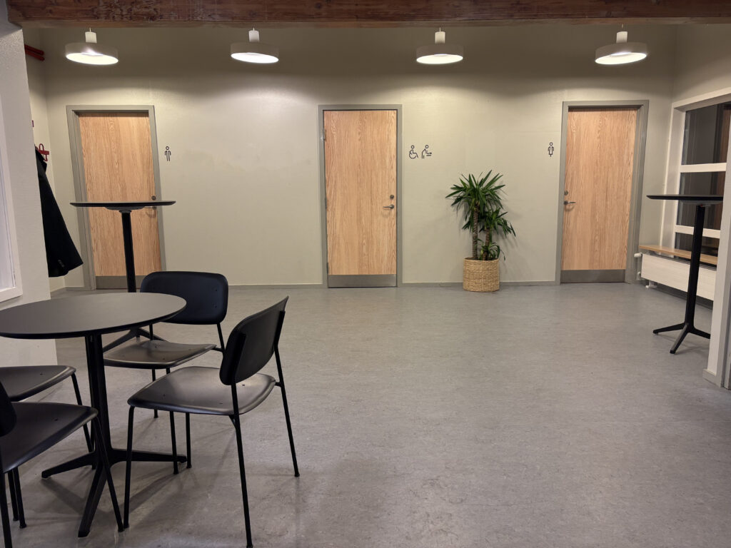 Birklíknandi folio er lagt á hurðarnar í forhøllini, sum vóru bláar. Nýggir møplar eru komnir í forhøllini, so til ber at seta seg niður ella standa við eitt háborð og fáa sær ein kaffimunn. Harumframt eru radiatorarnir útskiftir, ið eisini kunnu brúkast sum benkur.