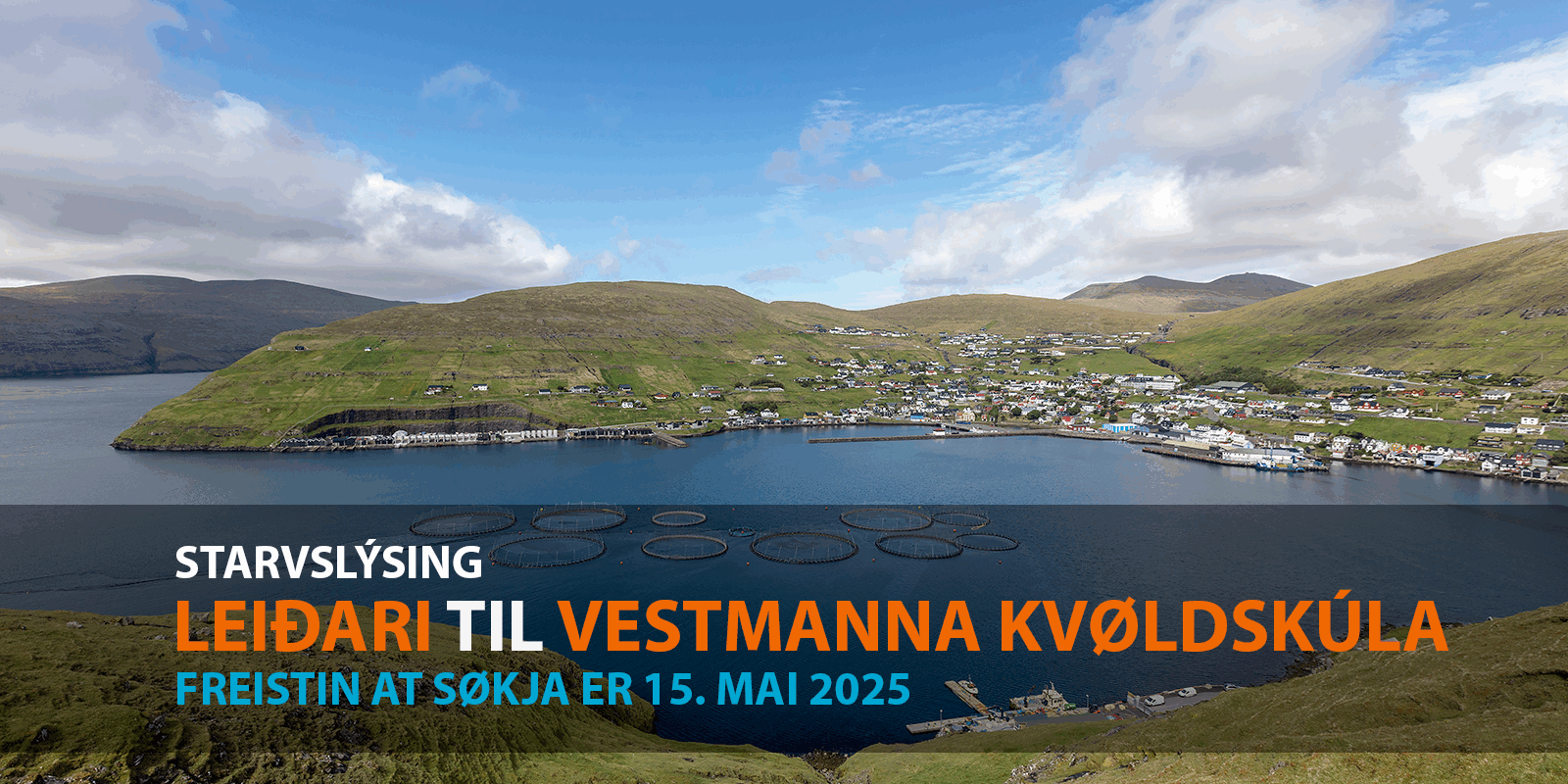 Vestmanna kommuna søkir eftir einum dugnaligum og ágrýtnum leiðara til eitt áhugavert starv sum leiðari fyri Vestmanna kvøldskúla at byrja 1. juni 2025 ella skjótast til ber eftir hetta.