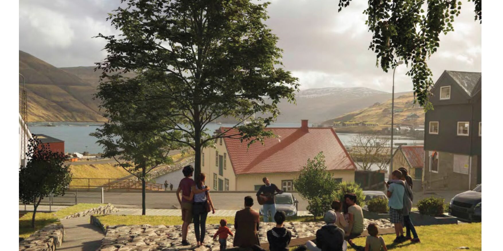 Ætlanin byggir á at útjavna hallið frá Skálavegi inn á parkeringsgeiran og áfram inn á fiskastykkið. Flatan frá hvørjum einstøkum parkeringsbási heldur áfram inn á fiskastykkið við hæddarspæli og bríkum í vallaðum lendi. Træbenkur kunnu setast eftir laðaðu kantunum til fólk at sita á – ella sitast kann á laðaðu kantunum. Laðingin niðan við Gjógvará verður varðveitt.