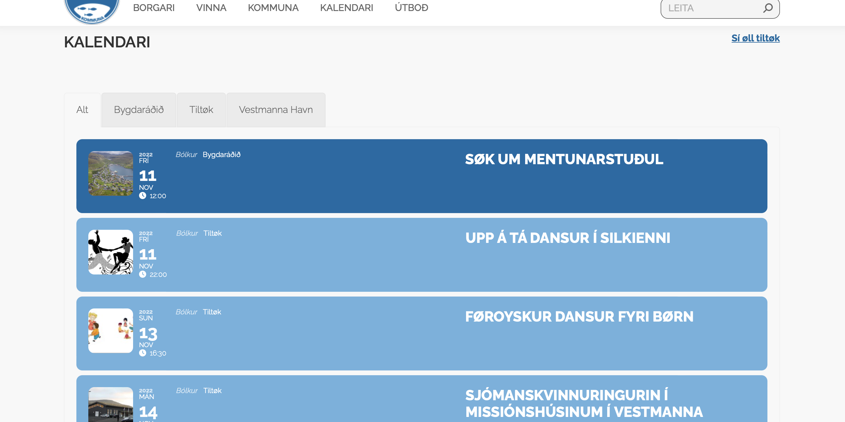 Nýggjur kalendari er lagdur á heimasíðuna, har ætlanin er, at flest øll tiltøk o.a. í kommununi verða løgd á, t.d.: