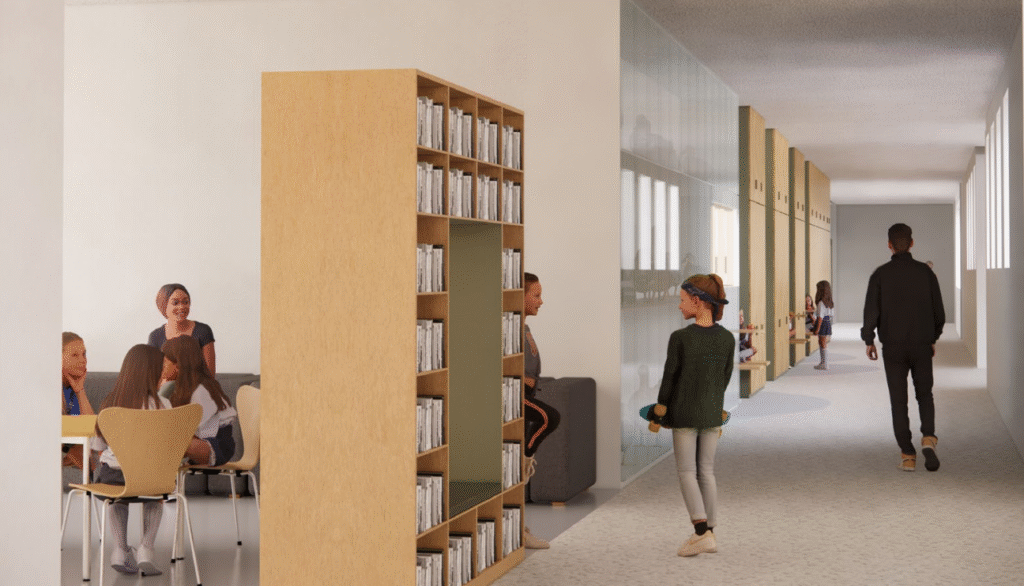 Í uppskotinum hjá arkitektastovuni, EYA, verður lagt upp til, at bókasavnið flytur inn í fimleikasalin, fyri at vera staðsett miðskeiðis millum gamla- og nýggja skúla. Enn er ikki fastlagt, um hølini skulu brúkast til bókasavn, fimleikahøll ella eitt triðja endamál.