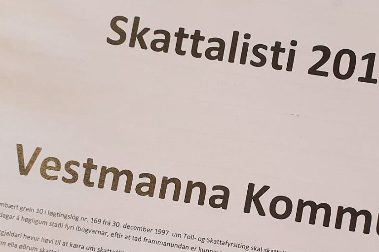 Skattalistin fyri árið 2023 liggur frammi til alment eftirlit á kommunuskrivstovuni frá 5. novembur til og við 19. novembur 2024 Kommunuskrivstovan er opin mánadag til fríggjadag kl 09:00 – 15:00.