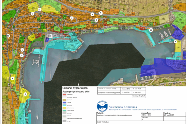 Broytingar í byggisamtyktini og bygdarskipanini fyri Vestmanna kommunu. Við heimild í løgtingslóg nr. 13 frá 21. mai 1954, seinast broytt við løgtingslóg nr. 19 frá 18. mars 2013, um býarskipanir og byggisamtyktir verður við hesum boðað frá, at Vestmanna Bygdarráð á fundum 21. mai og 18. juni 2025 hevur samtykt broytingar í byggisamtyktini og bygdarskipanini…