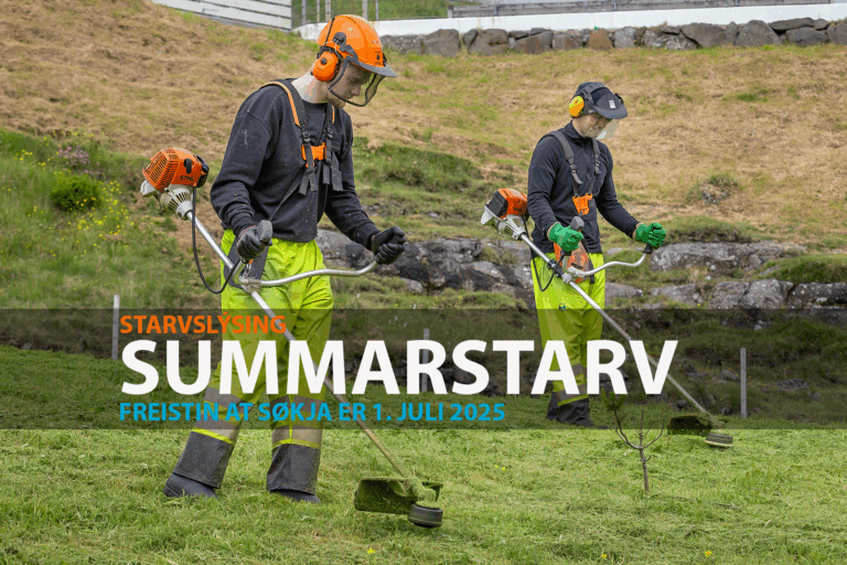 Hevur tú hug at hjálpa grøna toyminum í Vestmanna kommunu í summar? Vestmanna kommuna søkir eftir tímaløntum summaravloysara. Arbeiðsuppgávurnar eru: At lúka og røkja økir í kommununi saman við grøna toyminum Hjálpa til við teimum grønu økjunum og gøtunum í kirkjugarðinum Grassláing Annað fyrifallandi arbeiði Um teg: Sum persónur ert tú ágrýtin, forvitin…