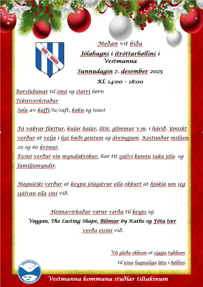 2025Sun07Des14:0018:0014:00 - 18:00(GMT+00:00) BólkurTiltøkMeðan vit bíða - Jólahugni í ítróttarhøllini í Vestmanna